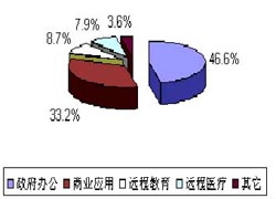 視頻會議系統(tǒng)在我國開始發(fā)展的初期,政府部門的應(yīng)用就占據(jù)了重要位置,覆蓋中央到直轄市和各省會城市的國家公眾視頻會議骨干網(wǎng)已經(jīng)完工。自1994年9月投入使用以來,國務(wù)院等機關(guān)先后利用該網(wǎng)召開了三百多次全國范圍的可視通訊會議。整個系統(tǒng)運行情況良好,得到了國家領(lǐng)導(dǎo)人和各部委領(lǐng)導(dǎo)的高度贊揚。近年來隨著電子政務(wù)工程的逐步推進,政府部門更加關(guān)注視頻會議系統(tǒng)建設(shè)。在經(jīng)濟發(fā)達地區(qū)(例如浙江、山東、廣東),視頻會議網(wǎng)已覆蓋到地市級城市,有的甚至覆蓋到縣一級。除各級政府之外,其它諸如檢察院、法院、公安和和水利等職能部門也是視頻會議系統(tǒng)的重要用戶。如圖1所示,政府辦公已占全部市場份額的46.6%。
