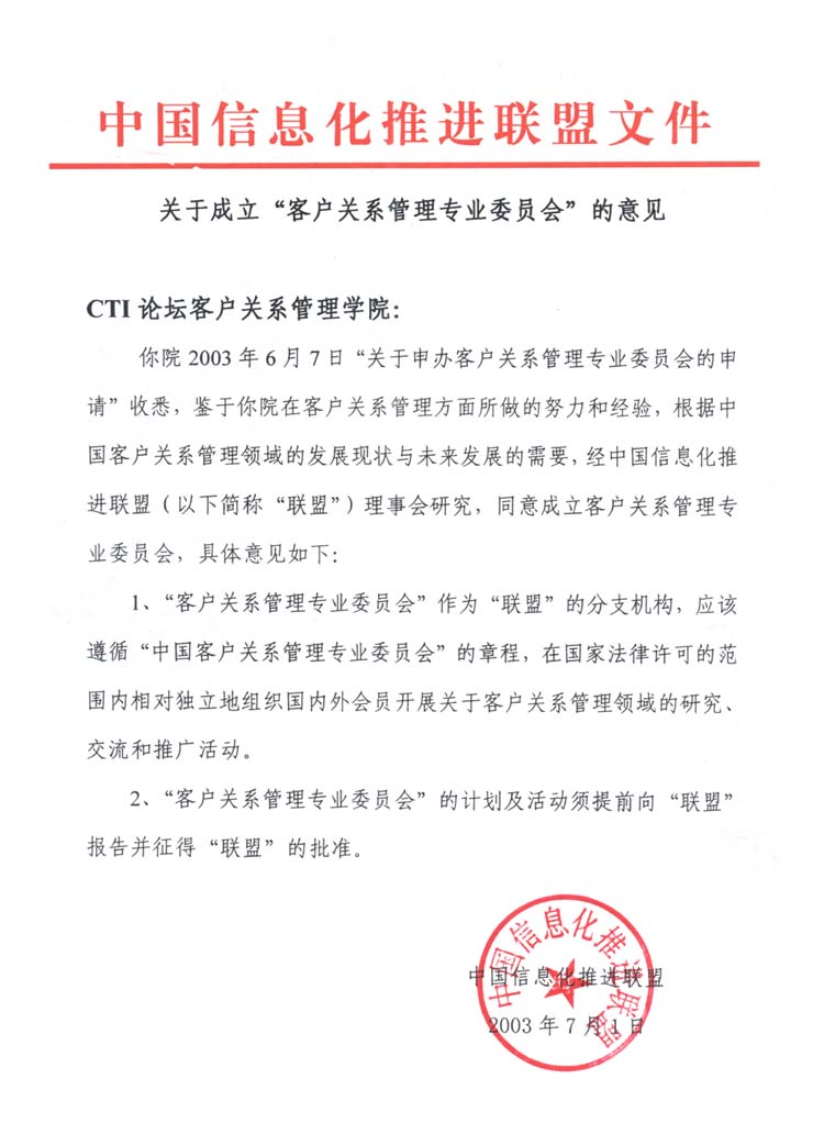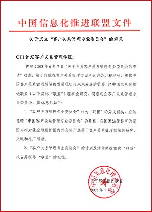 近日,由中國(guó)移動(dòng)、中國(guó)網(wǎng)通、中國(guó)聯(lián)通、海爾集團(tuán)、聯(lián)想集團(tuán)、摩托羅拉、微軟、CTI論壇等20多家單位發(fā)起籌備的"中國(guó)客戶關(guān)系管理專業(yè)委員會(huì)"(以下簡(jiǎn)稱專委會(huì)),經(jīng)信息產(chǎn)業(yè)部中國(guó)信息化推進(jìn)聯(lián)盟的批準(zhǔn),正式在京成立。