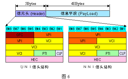 ATM信元實際上就是分組,為區(qū)分X.25分組(Packet)改稱為信元(Cell)。ATM信元具有固定的長度,總長為53字節(jié)。其中前5個字節(jié)為信頭(Header),包含各種控制信息,包括信元目的(邏輯)地址、糾錯碼、業(yè)務(wù)控制和維護信息等;后面48字節(jié)為信息字段(Payload),又稱凈荷,其中包含了業(yè)務(wù)的數(shù)據(jù),它們將被透明地傳輸。信元結(jié)構(gòu)如下圖6所示。在UNI接口和NNI接口上ATM的信元頭結(jié)構(gòu)是不同的。