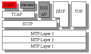 智能網(wǎng)的通信采用SS7信令,SS7信令系統(tǒng)中的智能網(wǎng)應用部分(INAP)是專門用于智能網(wǎng)通信的。INAP是建立在TCAP和SCCP協(xié)議層之上的,在下面SS7協(xié)議棧中可以看出INAP在SS7協(xié)議棧中所處的位置:
