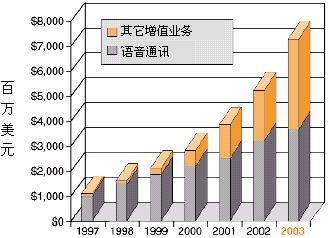 為了獲得競(jìng)爭(zhēng)優(yōu)勢(shì),業(yè)務(wù)提供商──傳統(tǒng)長(zhǎng)途運(yùn)營(yíng)和本地交換運(yùn)營(yíng)商,因特網(wǎng)業(yè)務(wù)提供商(ISP),應(yīng)用業(yè)務(wù)提供商,以及無線運(yùn)營(yíng)商──都在想方設(shè)法發(fā)布基于IP的業(yè)務(wù),這些業(yè)務(wù)應(yīng)該:對(duì)用戶有較高的價(jià)值,能縮短面市所需時(shí)間,部署是低成本高效益的。向用戶提供高價(jià)值的增值業(yè)務(wù)能為業(yè)務(wù)提供商帶來重要的收入源泉,并使他們更有特色,增加市場(chǎng)分額,特別是如果這些業(yè)務(wù)以快速、易于支持的方式部署,以上這些優(yōu)勢(shì)就會(huì)更加突出。據(jù)估計(jì),到2003年增值業(yè)務(wù)設(shè)備僅在美國就能達(dá)到73億美元的市場(chǎng),正如圖1所示。