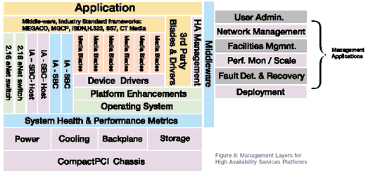圖8展示了管理層的外觀,它兼容PICMG 2.16的CompactPCI平臺(tái)。在較低的水平上,系統(tǒng)的健康和性能度量標(biāo)準(zhǔn)通過平臺(tái)的可替換單元(FRUs)和中間設(shè)備之間互相通信的平臺(tái)性能提升得以實(shí)現(xiàn)。HA管理軟件層提供健康和性能方面的度量標(biāo)準(zhǔn)和最高層管理應(yīng)用之間的通信。