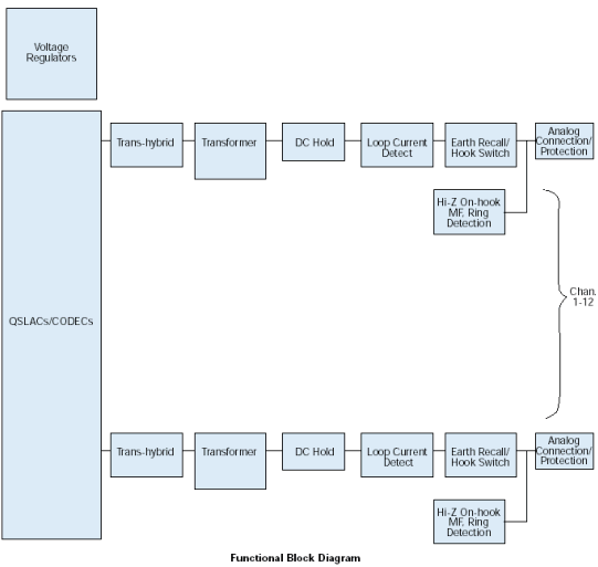 來自12個(gè)環(huán)路電話線的信號(hào)首先通過電話線路接口連接到D/120JCT-LS板卡上,該接口提供瞬變保護(hù)和電磁干擾(EMI)刪除(參見子板塊圖)。這些電話線路接口使用可靠的晶體摘掛機(jī)開關(guān)(無機(jī)械接觸)和FCC-Part
