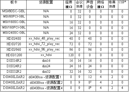 DISI16R2, DISI24R2, 和 DISI32R2 板有16個(gè)可以取消回聲的會(huì)議資源,DI0408LSAR2有9個(gè)可以取消回聲的會(huì)議資源,MSI板有32個(gè)不能取消回聲的會(huì)議資源。HDSI產(chǎn)品目前還沒(méi)有會(huì)議資源。