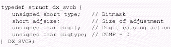 。。速度/音量調(diào)節(jié)表(DX_SVMT)數(shù)據(jù)結(jié)構(gòu)有21個代表不同級別的速度和音量的條目,用于指定信道的速度或者音量調(diào)節(jié)的變化率。這些值可以設(shè)置或者用dx_setsvmt()和dx_getsvmt()從表中取值。