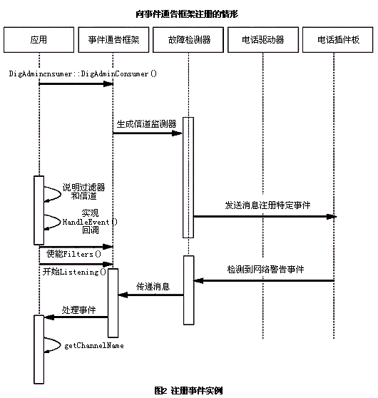 。。系統(tǒng)版包括事件服務(wù)API和事件通告框架。這些API用來(lái)向事件通告框架注冊(cè)你的應(yīng)用?蚣苁鞘顾胁僮鳌⒐芾、維護(hù)和定制服務(wù)(OAM&P)向已注冊(cè)的電話(huà)應(yīng)用發(fā)送異步消息的子系統(tǒng)。關(guān)于事件服務(wù)API和事件通告框架的詳細(xì)信息,可以參考系統(tǒng)版文檔中的編程指南?蚣芎胁煌诺溃@些信道用來(lái)報(bào)告與操作人員的一些被動(dòng)或者主動(dòng)的動(dòng)作相關(guān)的事件。