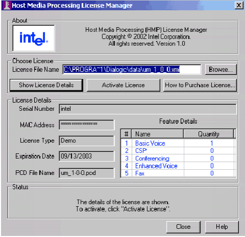 2. 如果HMP許可證管理器GUI沒(méi)有在屏幕上,可通過(guò)開始 > 程序> Dialogic HMP 1.0