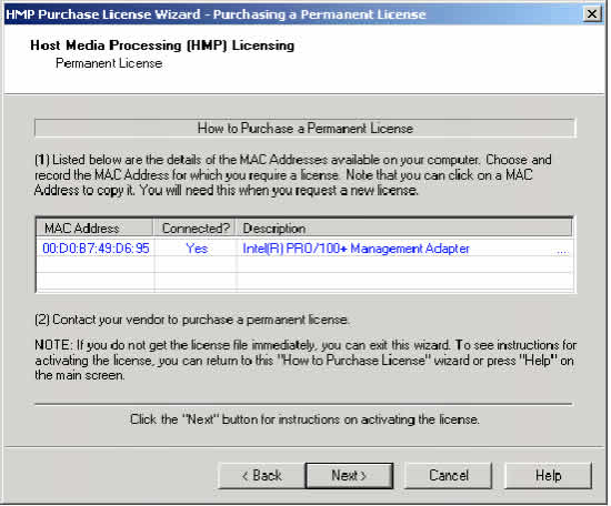 5. 聯(lián)系你的廠家購(gòu)買一個(gè)永久許可證。你必須提供從在4步中得到的MAC地址?色@得的許可證列表參見(jiàn)表3""HMP