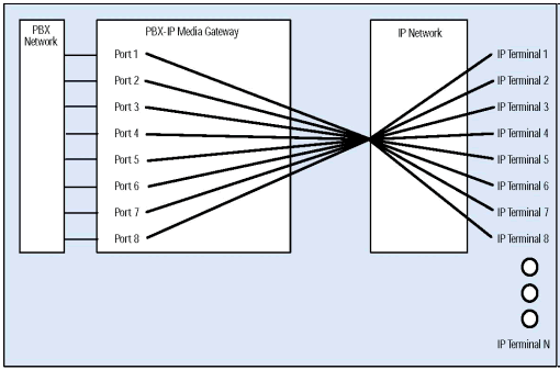 PBX-IP 媒體網(wǎng)關(guān)可以把IP電話連接到傳統(tǒng)PBX上, 給PBX集成了網(wǎng)絡(luò)應(yīng)用, 擴(kuò)展了PBX, 集成了企業(yè)局域網(wǎng)或廣域網(wǎng)語音,