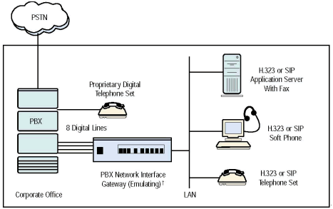 在這個場景, 一個模仿模式 PBX-IP 媒體網(wǎng)關(guān)通過它的數(shù)字線卡連接到傳統(tǒng)PBX. PBX可能連接到一些其它應(yīng)用例如語音信箱和自動語音回復(fù).